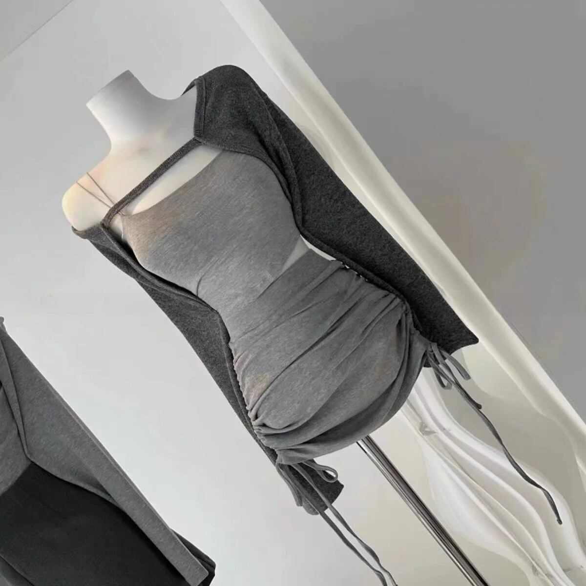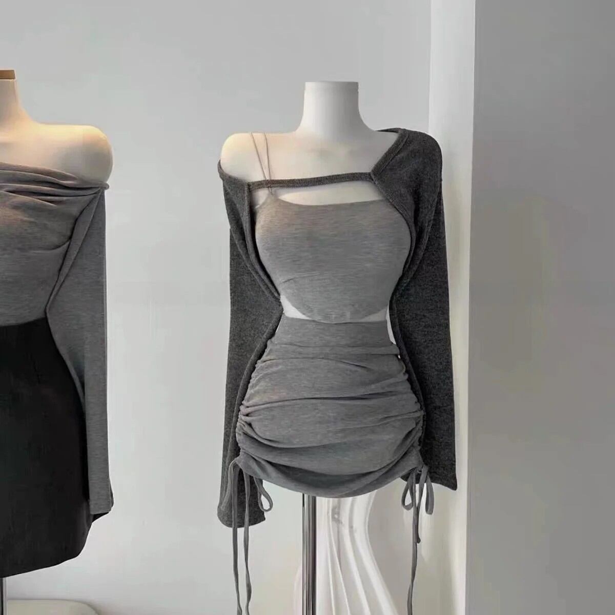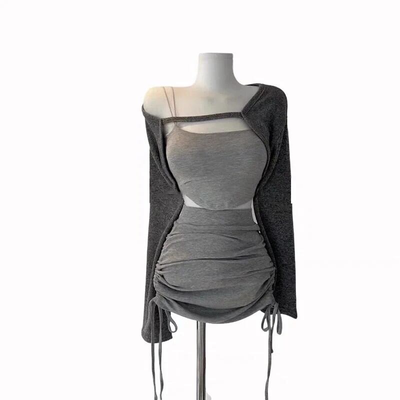 春のファッション ジェントルウーマン レトロ 韓国風 3点セット ドローストリングミニスカート ストラップレス トップス ハイウエストスカート
