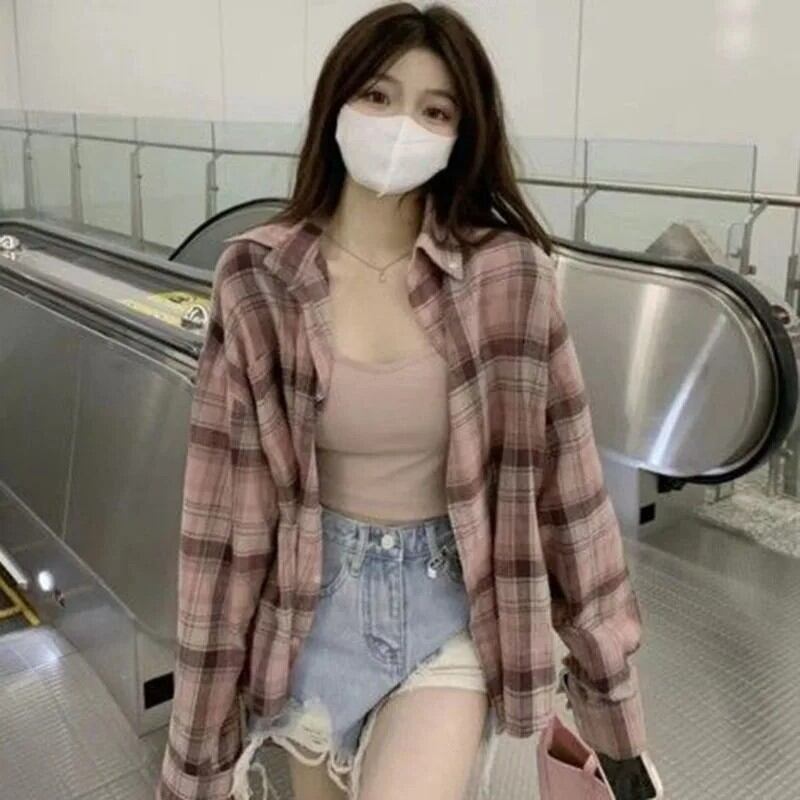 女性用のピンクのチェックシャツ,長袖,女性用のチェックシャツ,カジュアルでルーズ,シングルボタン,韓国のファッション,秋,新しい