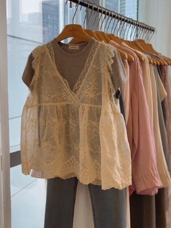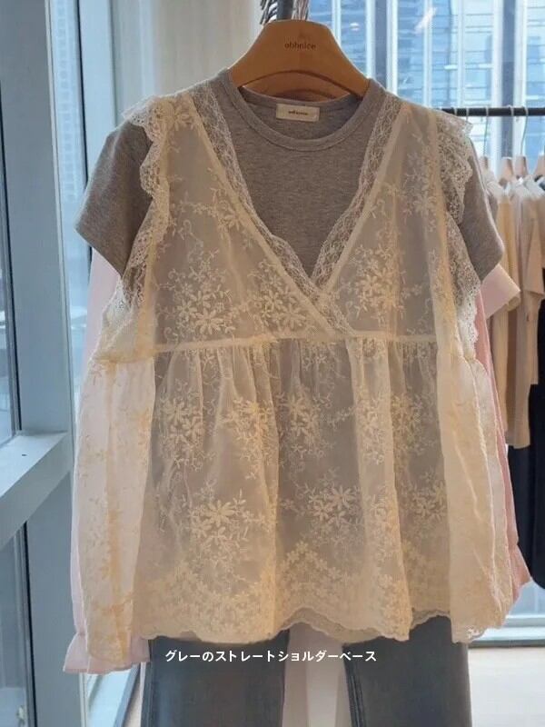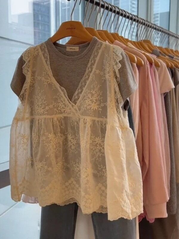 韓国スタイルのレースベスト半袖ラウンドネック通勤女性の夏のファッショントップ通気性ルーズフィットソリッドカラーシャツ