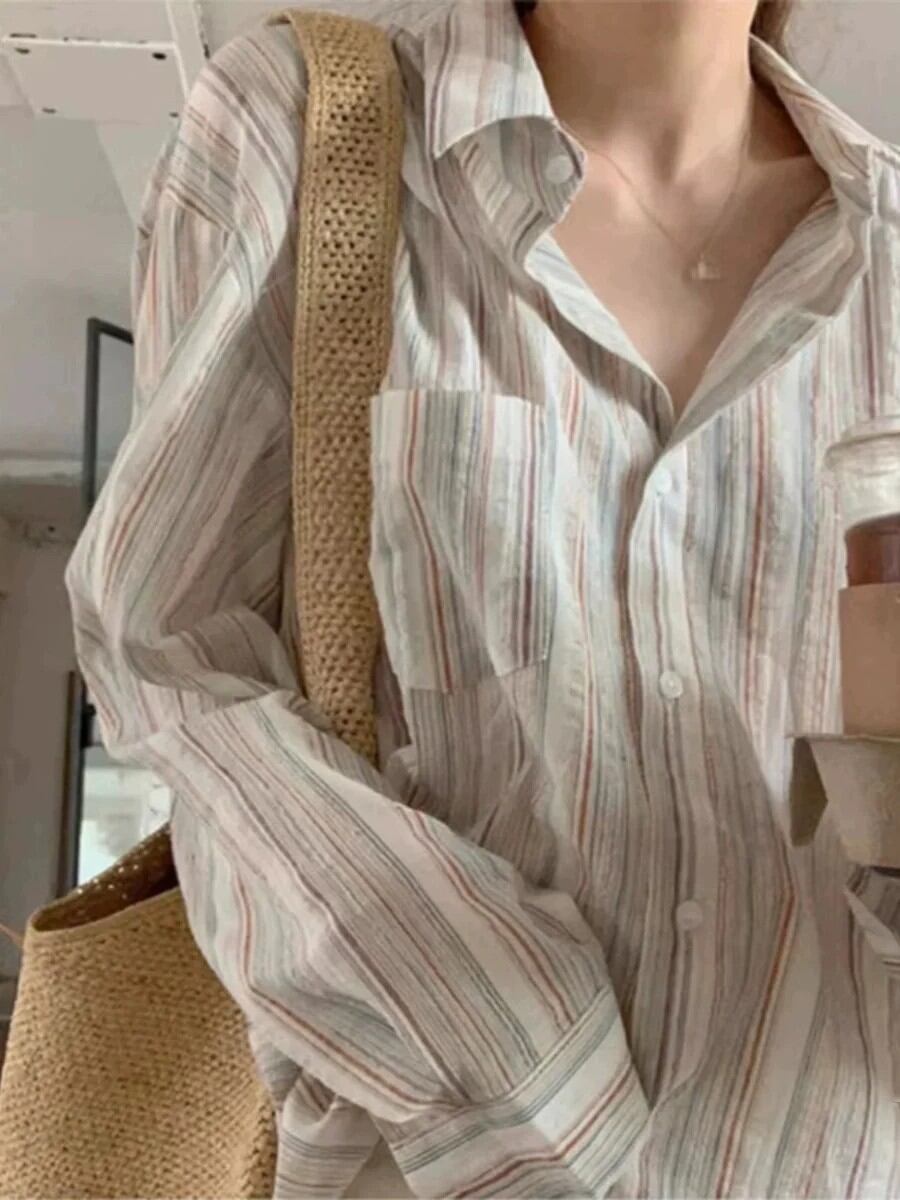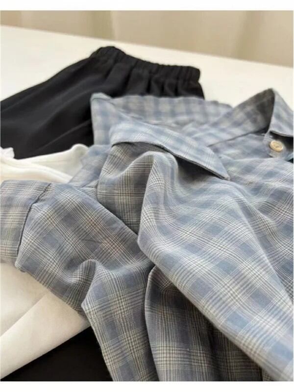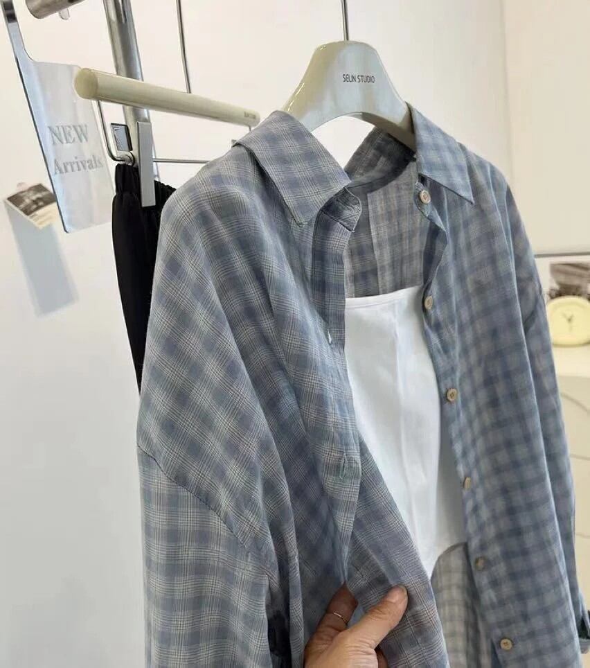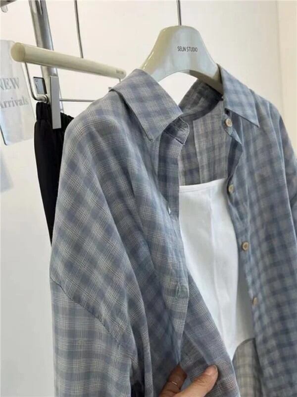 夏ファッショナブルな薄手の日焼け止めシャツ女性のミディチェック柄シャツアウタールーズフィット長袖ボタンアップ韓国スタイル