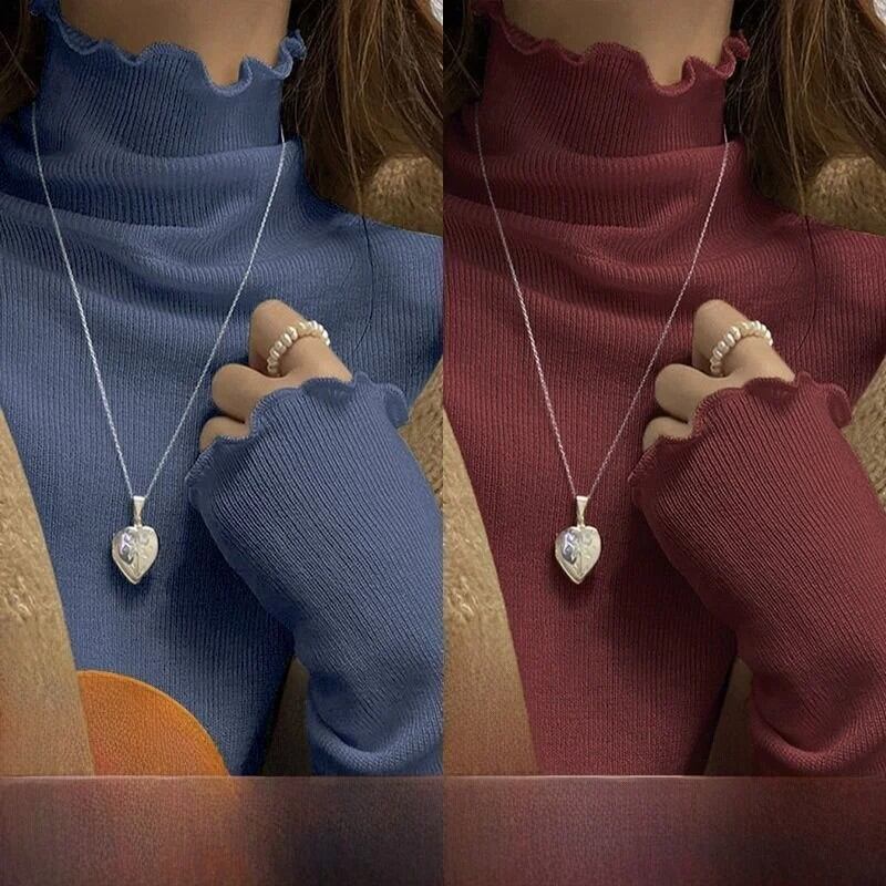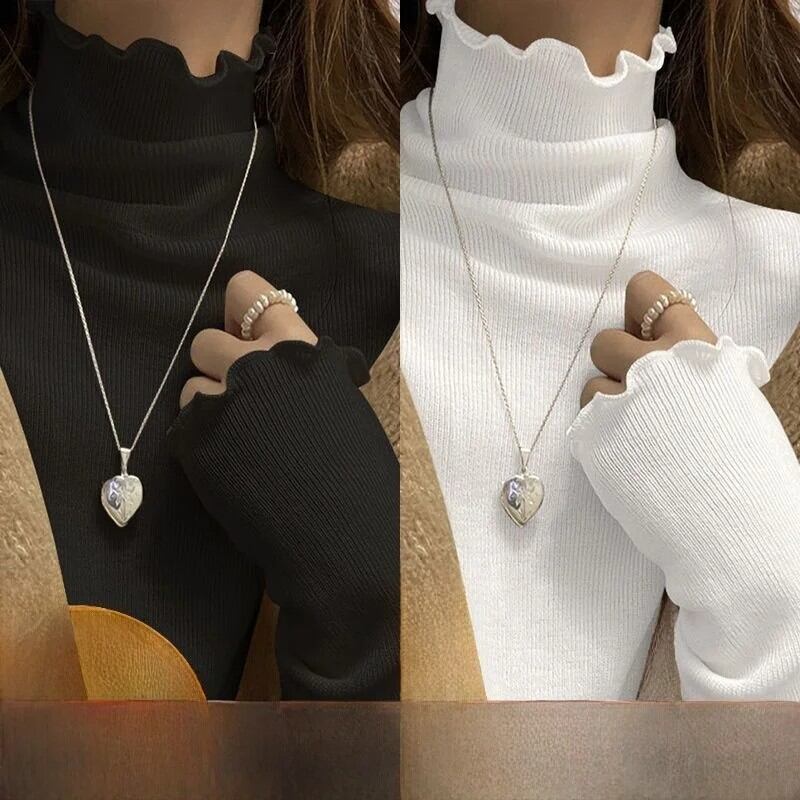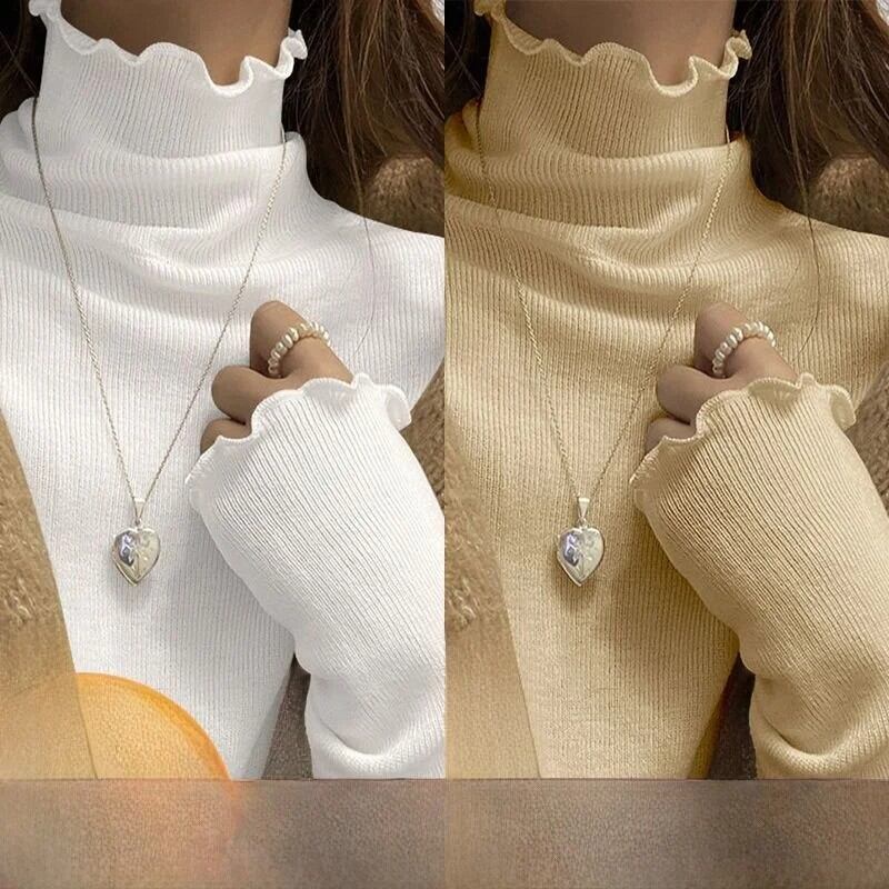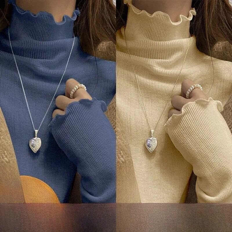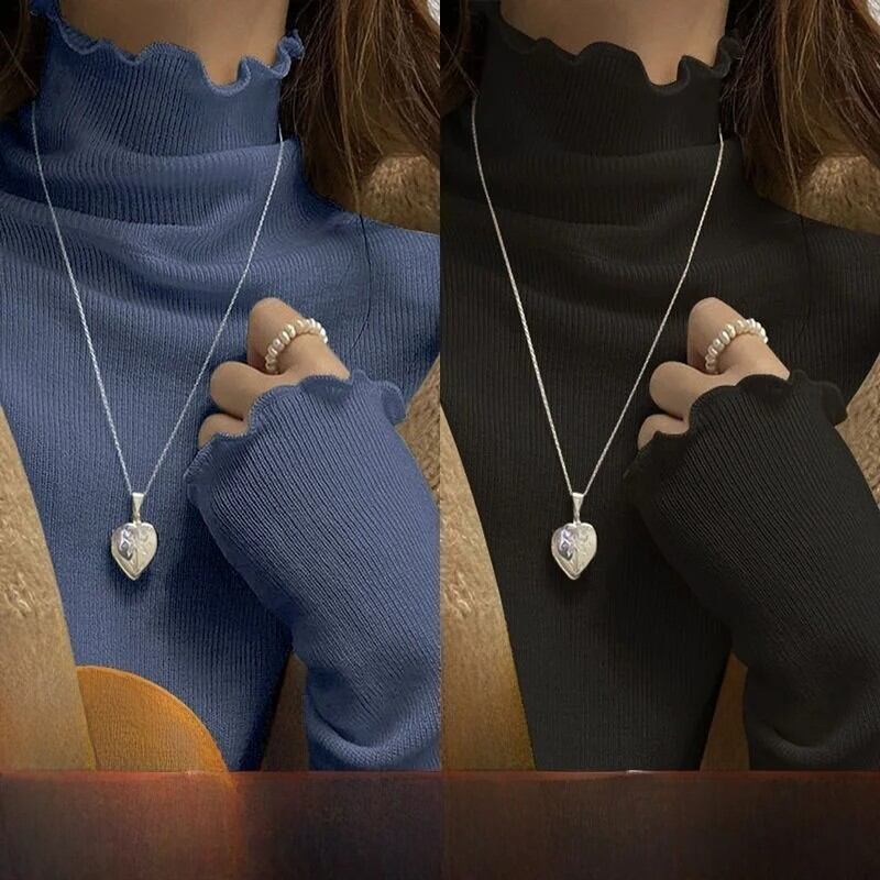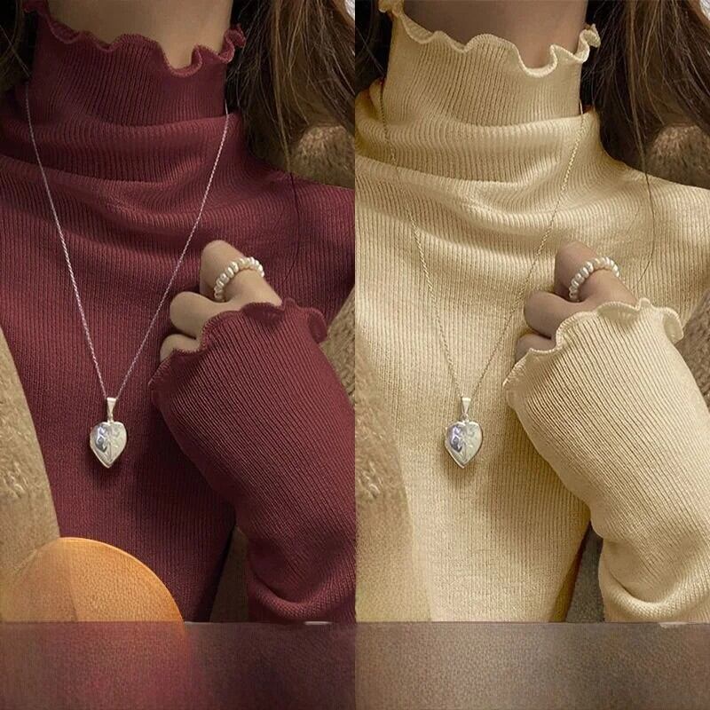 女性の長袖ハーフハイカラー Tシャツ暖かいインナーウェア学生リブベースシャツ木製エッジ秋冬ファッション